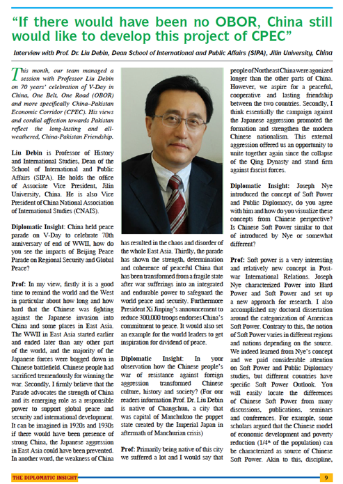 2015年9月5日,应巴基斯坦《外交视野》杂志的约请,刘德斌院长接受该杂志的采访请求,回答了关于中国纪念抗日战争暨世界反法西斯战争胜利七十周年大阅兵、中国软实力、中国的“一带一路”战略、中国的发展经验、中巴关系以及中巴经济走廊的前景等当下热门问题。采访全文刊登在该杂志今年第九期“北京大阅兵&中华人民共和国成立66周年”特刊的显要位置。本期杂志同时收录了91制片厂