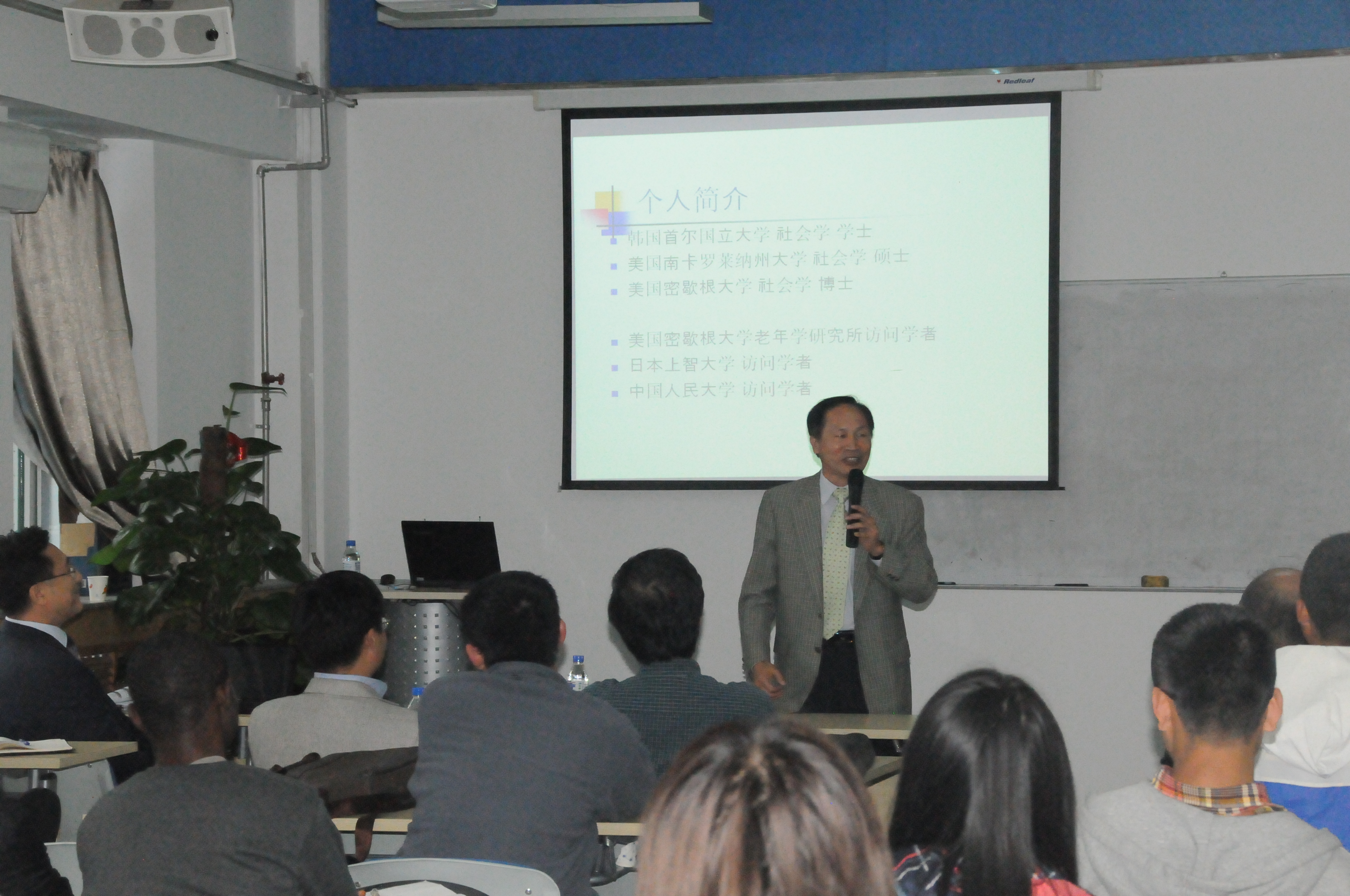 朴海镇教授在讲座中从权力转移、亚洲发展经验的多样性、对亚洲发展经验的解释、全球化趋势对经济发展及民主化的影响等方面对亚洲国家的现代化发展进行阐释,指出亚洲国家在发展中的经验教训及不同要素在这个过程中所发挥的作用,并对新亚洲发展模式进行了展望。金益基教授首先对中、日、韩三国的历史与社会文化进行对比并从中剖析三国在文化上的联系与差异,进而对“韩流文化”进行了全面而深刻的介绍与论述,对韩国及亚洲文化在未来的走向给出了独到见解。两位教授的讲座深入浅出、条理清晰,得到了91制片厂留学生及2014级本科生的积极响应,现场的问答与交流环节气氛热烈。