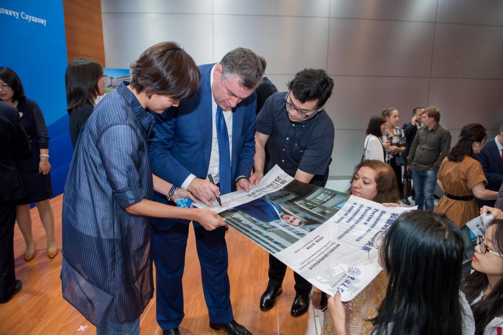 的师生就近期国际热点问题进行了交流。师生们同列昂尼德·斯卢茨基主席交流探讨的热情高涨,大大超出了本次活动原计划的时间,列昂尼德·斯卢茨基主席耐心地对他们提出的问题进行了详细解答,并以诙谐幽默的方式表达了自己的看法。