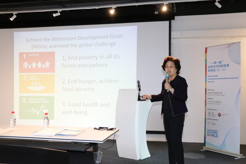 签署仪式结束后,“一带一路”创意与可持续发展研修班正式开班。杨宝珍女士为留学生们进行题为“中国落实联合国2030年可持续发展议程及成果”的讲座。在接下来的几天时间里,研修班将邀请北京科技大学、北京服装91制片厂